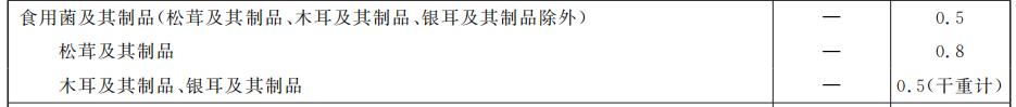 食用菌可分为栽培食用菌和野生食用菌。野生食用菌中重金属的污染受生长环境影响,无法通过人为措施予以控制,并且个别野生食用菌品种对于某些重金属有富集特性。此次标准修订收集了我国常见栽培食用菌和野生食用菌中重金属污染数据,分析各类食用菌对不同重金属的富集特性,开展食用菌中重金属暴露的风险评估,修订后食用菌及其制品的重金属限量指标更加有针对性,如木耳及其制品、银耳及其制品中无机砷限量为0.5mg/kg(干重计),松茸及其制品中无机砷限量为0.8mg/kg,其他食用菌及其制品中无机砷限量为0.5mg/kg。